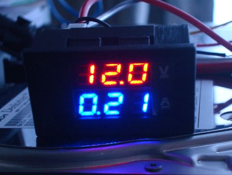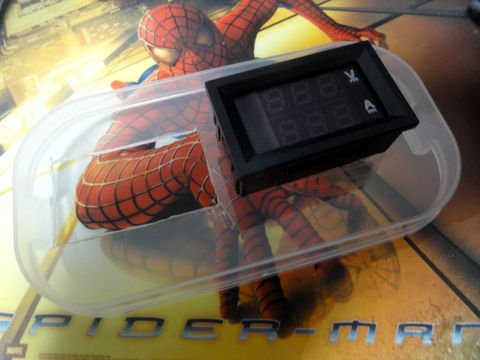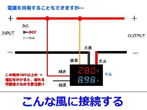 接続はこんな感じ電圧電流計の線が短いので引っ張られてしまう、簡単なケースにでも入れた方が安全かも。 |