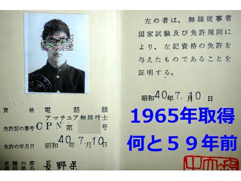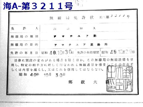 以前の無線局免許を発掘1965年10月に発行された無線局免許状、この頃は業務用もアマチュアも全く同じ書式で発行されていた。 有効期間5年で更新必要。50MHzーA3のみ、出力は10Wとなっている。 |
