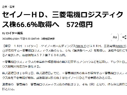 三菱電機が物流会社を1/3持ち株に三菱電機ロジスティックスの株式2/3をセイノーへ売却するとの記事、調べてみると日立物流もKKRへ売却しロジスティートと 社名も変更、東芝はとっくの前に売却し現在はSBS東芝ロジスティックスに、富士物流は三菱倉庫へ。 |