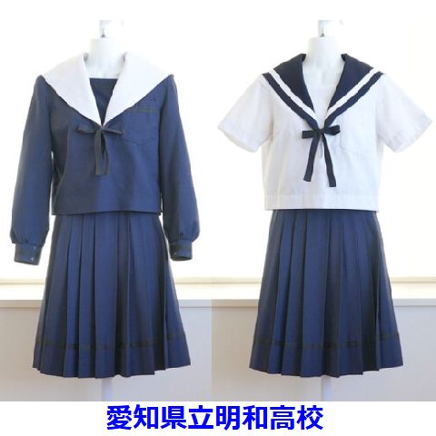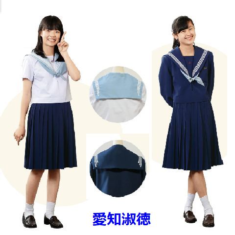 愛知淑徳学園:ちょっと変わった色今年からブレザーの標準服に変わり(男子は普通の学生服だった)、愛知県立第一高女からの伝統の制服を廃止した。 愛知淑徳は薄いブルーのちょっと変わった色のセーラーで目立つ、後ろの線が下部で切れているのが特徴。 |