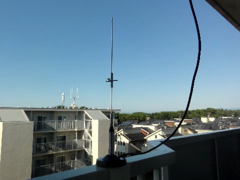 アンテナ基台、さっそくやってみた天気が回復し暑くなりそうな朝、さっそく手摺に沿って曲げてアンテナ基台を乗せてみた。今のところでは 入感感度のアップは認識できていないが。アマチュア無線では出力を2倍にするよりゲインが+3dBあるアンテナを使う方が 効果的で省エネにもなる、アンテナが勝負のポイント。2級や3級免許は要らないかも(講習で取ると1万数千円かかる)。 |