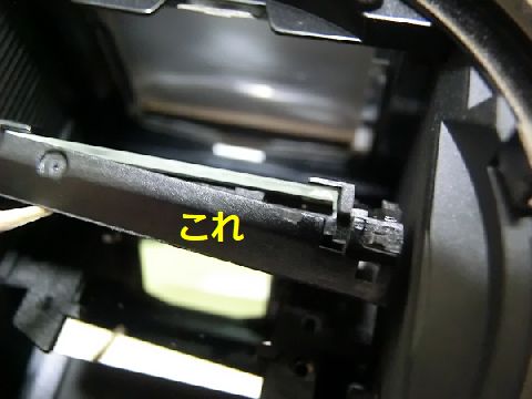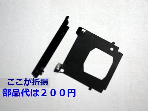 今度はα700が壊れたレンズを交換し取り付けようとすると引っ掛かって回せない、良く見ると落下部品、ミラー周りの部品でミラー下部を支えて いたパーツらしいが片方は折れて脱落、固定してない?折れた部分はどこへ行ったのだろうか。 |