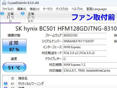 ファンの効果は大きい:−20℃今のところヒートシンクは在り合わせのメタル片で代用、それでも43℃で安定状態に(気温は25℃)、前回は63℃と警告レベル。 ファンは東芝熱器具製12V-0.05Aなので消費電力は0.6Wとエコノミー。 |