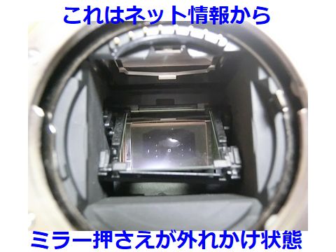 購入から14年半経過、寿命?とりあえず組み立てて撮影確認、ミラー角が狂うと撮影画像が上下に狂うので困ったもの。裏の黒い穴あきシートは上部の耳が 引っ掛かってうまく入らないので切除してミラー下へ入れた。 ミラー下部を接着剤で押さえる修理しか方法はなさそう。 |