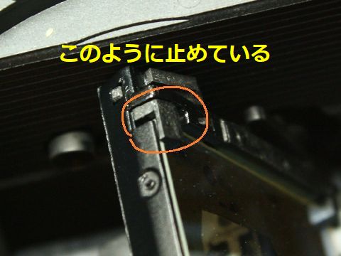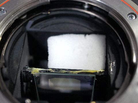 α700脱落ミラー押さえを接着修理今回はエポキシ樹脂でなくG17ボンドで接着、作業し易いようにミラーを持ち上げ作業、あまり力が掛からないはずなので大丈夫だろう。 しかしα900のミラー落ちに続けてα700のミラー押さえ破損(止めている穴の部分が片側破損して脱落)とはさすがSONYと感心するしかない。これもSONYタイマー? |