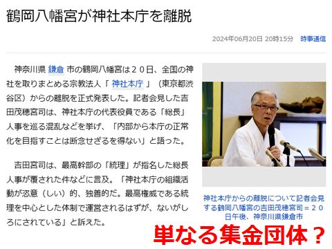 鎌倉八幡宮など3社が神社庁を離脱みっともない内輪もめで離脱が続く神社庁、内部に改革するという気概はなく権力争いに明け暮れているイメージが定着。 独立して困らない神社は次々離脱、いまや単なる集金マシンでしかない事実が露呈。 |
