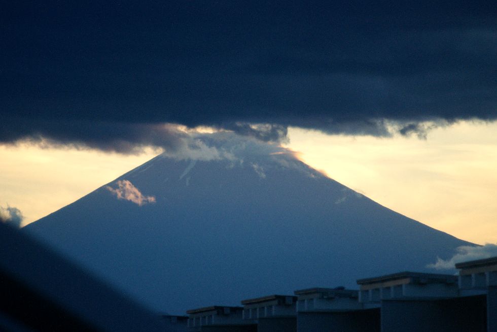 怪しい空の富士山夕景日没直前に富士山頂が何とかみえる状態に、上空には真っ黒な雲が厚く掛かっている。