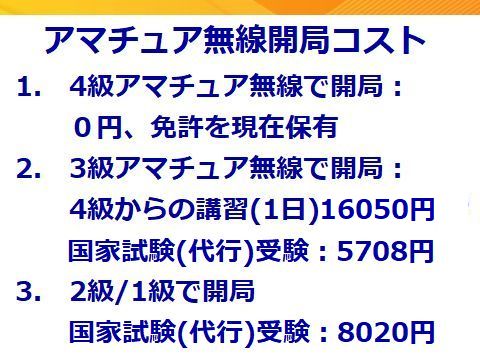 またアマチュア無線、やってみるか?昭和40年に取得した従事者免許(当時は電話級、今は4級)、 終身有効なので開局することも問題なし、ただ出力が10Wまで (VHF以上は20Wまで)なので無線機は割高となる。 2級/3級を取れば50W機も使えるが、新品は高価なので程度の良い中古を探すか? |