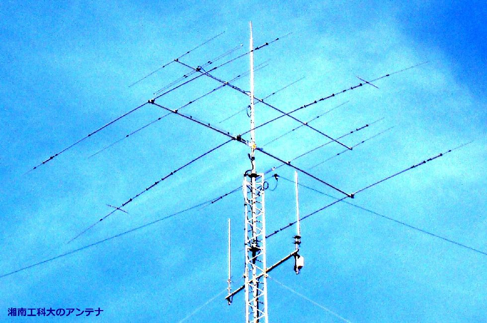 湘南工科大のアンテナさすが大学のクラブ局、屋上に鉄塔を建てて大型のマルチバンド八木が2つ(3エレと5エレ)にローテータ、他にホイップアンテナも。