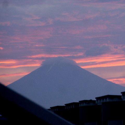 夕暮れの富士山・赤焼け太陽が沈む位置が北へ行っているので富士山近くは真っ赤にはならず穏やかな夕焼け。 |