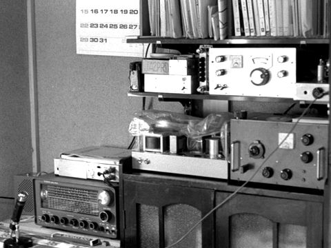 1968年頃のアンテナと弟のリグのようす局免許は取ったが自宅では運用せずもっぱらクラブ活動が中心だった。リグは弟がJA2PRDで運用、この頃にはアンテナも 水道管+3エレ八木になっていた。受信機はクリコン(Xtalコンバータ)+受信機(当時はTRIOの9R59)。 |