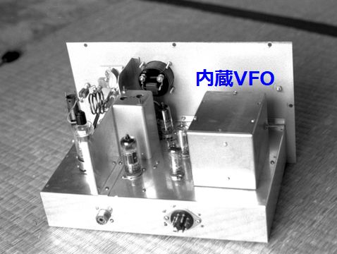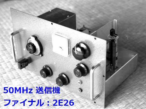 2代目の50MHz送信機(VFO内蔵)終段が2E26シングルの標準的な送信機、これは2代目でVFO内蔵、周波数の安定化にために工夫をしてある。 定電圧放電管でVFO部の電源電圧を安定化し発振コイルはシールドボックスへ収納、結果的にオーブン制御のような 形となり温度が落ち着くと周波数が安定した。終段のドライブは12BY7Aだったと思う、2E26との結合は複同調コイルを 使って調整レスにしてある。 |