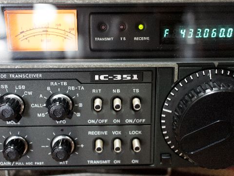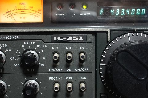 落札したICOM IC-351が届いた北海道・苫小牧からで着払い送料が1590円、発送から翌々日の到着。さっそく故障が多いという電源周りをチェック、まずはAC100V側の フューズをチェック、OK。AC電源で通電すると基本動作は問題ないよう(難ありは細部?)。 |
