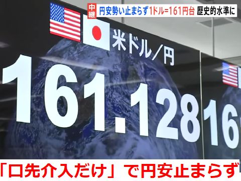 円高160円突破、無策の政府をあざ笑うよう「口先介入」など最早何の効果もなく、あっという間に160円突破、ちょっと前に150円突破で大騒ぎしていたのは一体何だったの? |