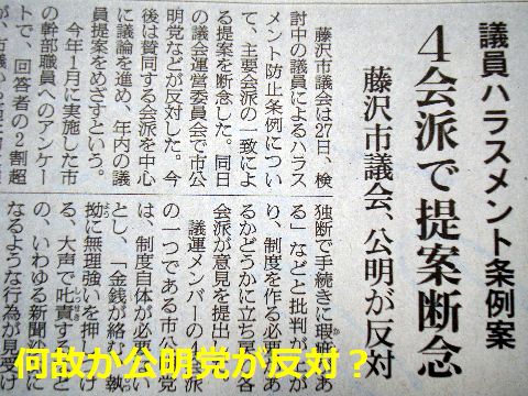 藤沢市の議員ハラスメント条例案、何故か公明党が反対「新聞沙汰になった事例がない」など意味不明の理由で公明党が法案の提案に反対しているとの報道、制定されると困る事態でも あるのかと勘ぐられる異常な対応。 |