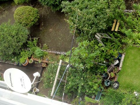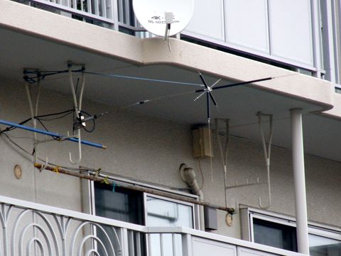 2階下のアンテナはこれ?HFから435MHzまでのマルチバンドアンテナ、使用しない時は安全のためか回転させてベランダ内へ引き込んでいるよう。 |