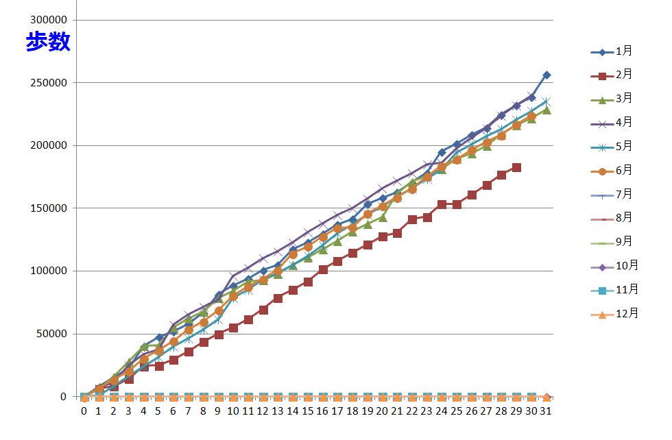 1-6月までの歩行記録:2月は体調不要だった?こうやって見てみると体調の良しあしが良く解る、2月は全体に不調でリカバリも出来ずだったよう。 |