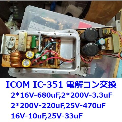 IC-351 電解コンデンサ交換作業電源ユニットの取り出しは昨夜やったので今日は基板上のコンデンサ交換、主回路のコンデンサ4つを交換。 まずは整流部の200V-220uFの2本、ついでシールドケース内の16V-680uFの2個、半田吸い取り線で半田を取り除きサクッと交換。 電源部は片面基板なので容易。それよりシールド部はネジ14本で止めてあるので取り外しが大変。 |