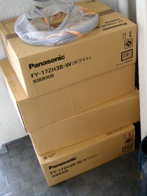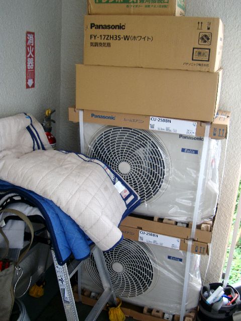 騒音対策の更新工事があちこちで工事から10年経過で故障品は更新する(ただし10年に一回限り)という工事、10年でエアコン・換気扇・台所換気扇が全部だめになるはずもないのに 何故か全数交換という大盤振る舞い、昨日はお隣が工事、今日は2階のお宅が工事。 |