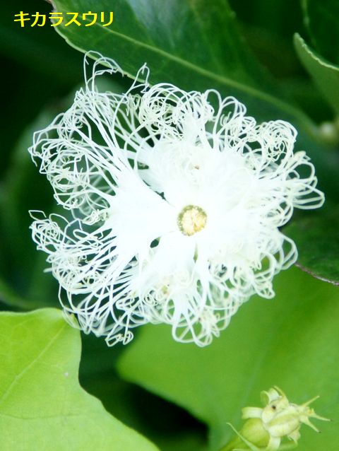 キカラスウリ夕方から咲く花だそう,いつも通る歩道橋の脇にあるがこれまで花には気付かなかった。 |