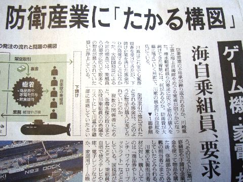 たかり体質の海自潜水艦部隊が露呈ゴッツアンどころかリクエストを出してプレゼントを要求していた潜水艦部隊、これに対応すべく裏金をせっせと作って いた川崎重工、20年以上もよくバレずに続いたもの。 |