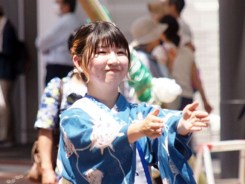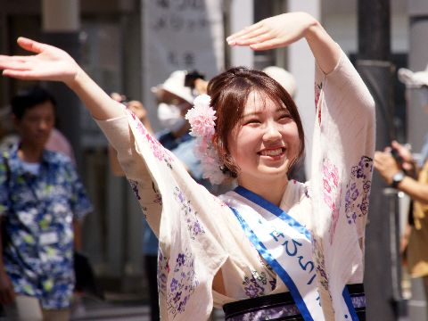 ミス七夕の踊りは人気以前はオープンカーでパレードだったが最近は3人が先頭で踊りながら行進するスタイルに、すぐ後ろには平塚市長も続く。 |