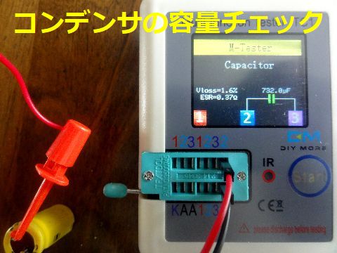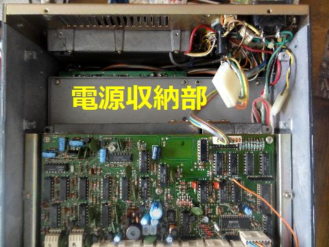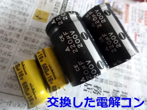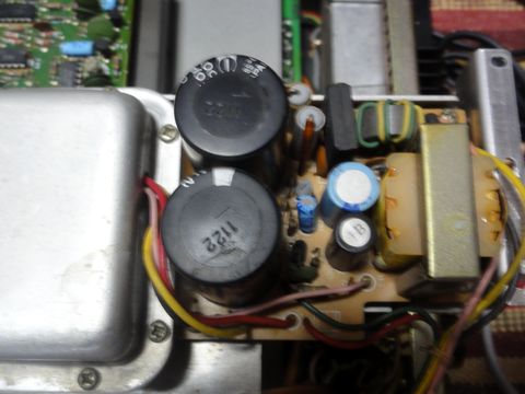 電源ユニットをコネクタで接続し元に戻す当時価格で15万円近い高級機なのでメンテ性は良く考えてある(狭いのでギシギシなのは仕方ない)。交換後は250V-220uFと16V-1000uFになった。 取り外したコンデンサの容量をチェック。200V-220uF(松下製)> 266/240uFで正常、16V-680uF(ニチコン製)>732/732uFで正常範囲内、あまり使われていなかった? |