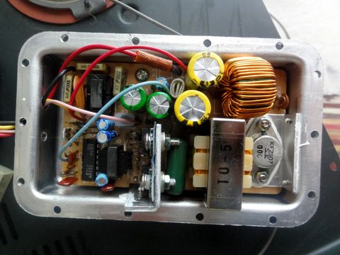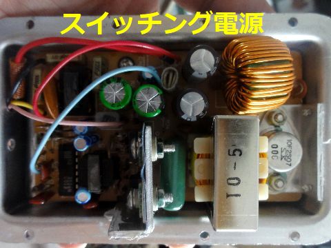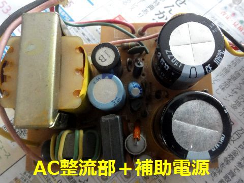 コンデンサ交換のため分解し基板取り出し基板はAC整流と電解コンデンサ部分とアルミケーズに入ったスイッチング電源部に分かれた2枚構成。基板は紙エポキシの 片面基板なので回路は追いやすい。コンデンサ以外でネオン管を使ったフォトカプラの劣化もありそう。 |