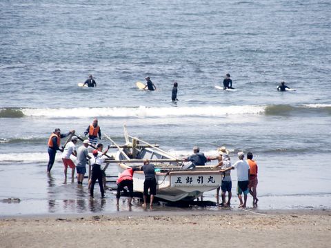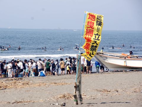 海岸では地引網も開催(貸切)どこかの自治会の地引網がサーフィン大会の横で開催中、もう網は引き上げられていて獲物を収集中。 |