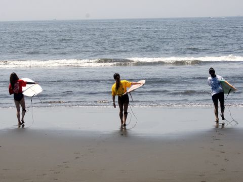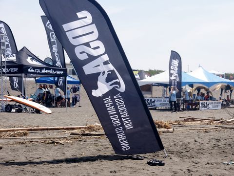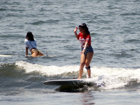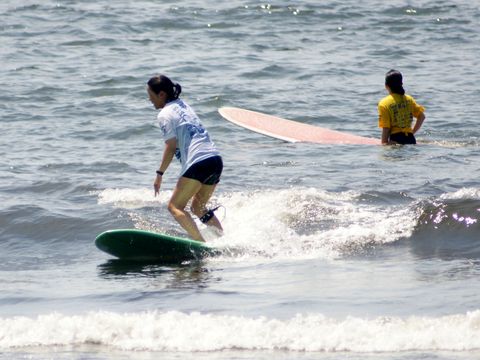 厳しい戦いが続く女性サーファーの部、3人ずつ競技をして採点、結果を競う。あいにく干潮で波も低く難度の高い演技は見られず。 |