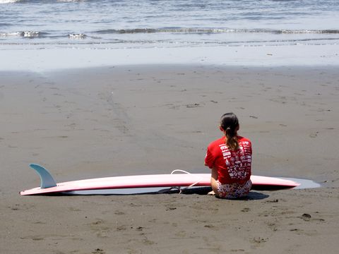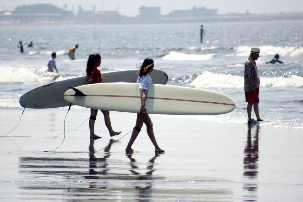 上級者が使うロングボードを抱えてさっそうと試合にのぞむ女性サーファー、格好良い。 |