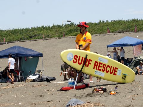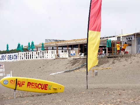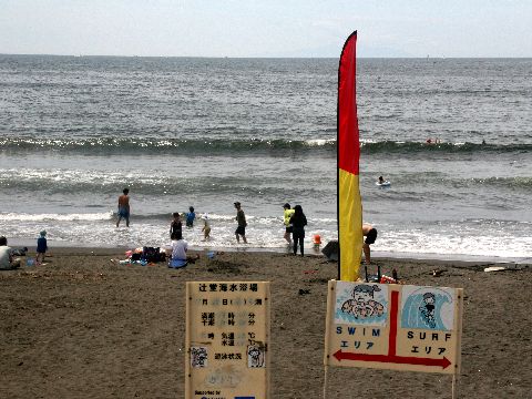 レスキューも待機、ちびっこサーファーもサーフレスミュー(サーフボードで救難活動)も監視中、子供のサーファーが元気一杯。 |