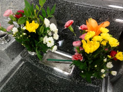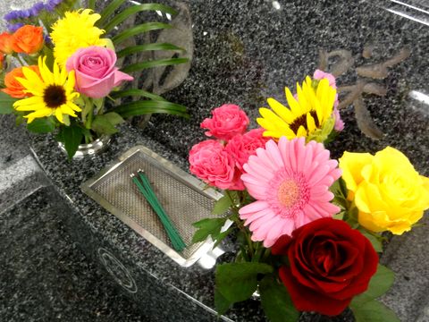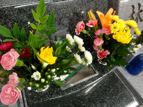 一日遅れの墓参りにイオンの98円の花が何故か復活していた、墓地の花は暑さ・乾燥で予想通り全滅。 |