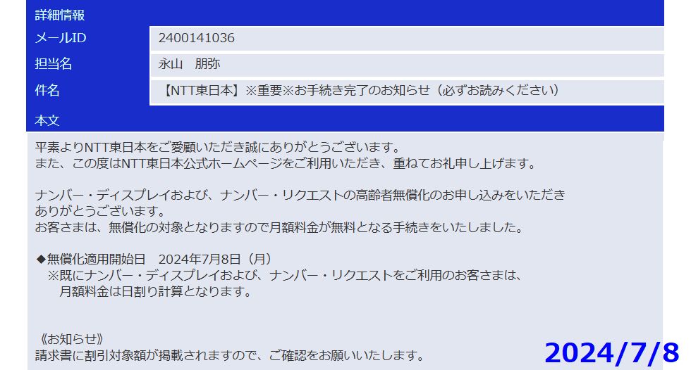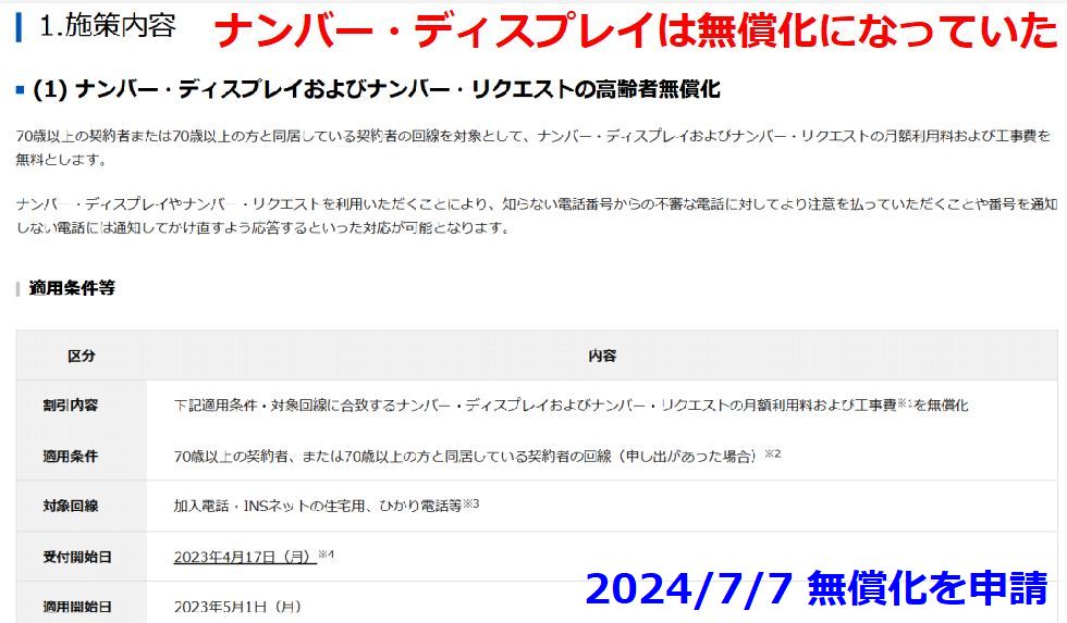 偶然見つけた「高齢者はナンバーディスプレイ無料」の記事随分前から詐欺電話撃退のために契約し毎月400円を払ってきたが昨年春から70歳以上の高齢者のいる家庭は無料となったとの 記事を発見さっそく無料化の手続きをと探すが見付けにくい、普通の申し込みの所に隠してある?ような感じ。無料化されるのは嫌だと いう心が透けて見える。 |