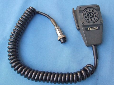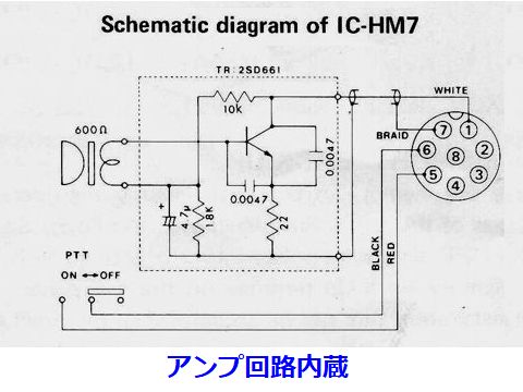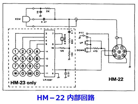 マイク互換性:ICOM HM-22こちらはエレクトレット・コンデンサマイクを使っている、アンプ回路に電源を供給。 HM-7には無いUP/DOWNボタンもキチンと動作する。 |