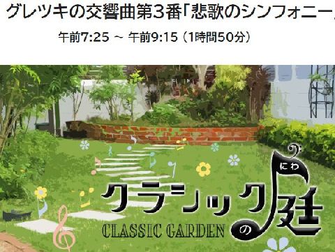 クラシックの庭、この春から前の番組のちょっと固い印象から変えようとする意図を感じるが。ナレーションを担当する二人も変わった(登レイナ、田窪菜穂子)。 |