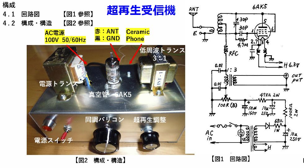 VHF帯超再生受信機の情報を見つけたた「超再生」には他励・自励のほかに幾つかのバリエーションがあるが昔作ったのはこの回路方式。作るのにあたり真空管6C4、タイトバリコン、 タイト・カップリング(バリコンは固定・回転側のどちらにも電圧が掛かっている)、1:3の低周波トランスを買った覚えあり。コイルはエナメル線 で自作、中間タップも適当に。RFCコイルは1Mオームの抵抗にエナメル線を巻いて製作した記憶あり。 |