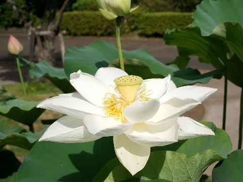 大船フラワーセンター早朝開園:蓮の花を見に朝6時台のバスで駅へ、なか卯で朝食。大船駅からのんびり歩いて7時40分頃には到着。結構な人がいるが 混雑していると言うほどでもない。 |