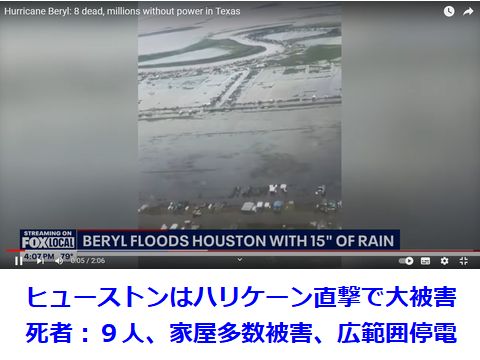 ヒューストンはハリケーンBERYLで大被害ハリケーンが直撃して広範囲で被害発生、川は溢れアンダーパス道路は冠水。以前出張で滞在中にハリケーンで 道路寸断、帰路空港へ行くのに大変だった。空港地上作業員・職員が空港へ来られずコンチネンタルは大混乱だった。 |