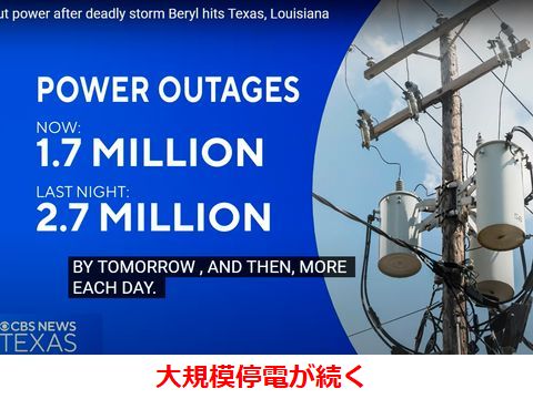 死者9名、停電が広範囲で続くまだ170万戸で停電続く、100°Fの暑さもあって大変な状況。停電地域が広いので混乱は続きそう。 |