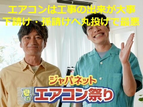 「ジャパネット」でエアコン購入は最悪!他の商品でもタダ同然の付属品を付けて大幅お得などと消費者をダマしているのだが、商品そのものはメーカ製なので 大きな問題はない。しかしエアコンは工事が必要な商品、下請けへ丸投げでその評判が最悪なのがジャパネット。 |