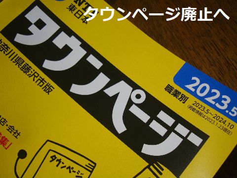 タウンページが廃止となるそうこの10年以上、タウンページは配られているが使った記憶がない。昔に比べ厚さは数mm程度、字も細かく見えない。 |