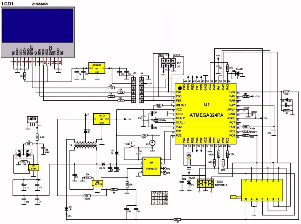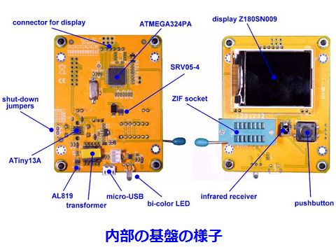 LCR-T4?の回路図:ネットで見つけた確かに測定端子がほぼそのままマイコンのI/Oポートへ繋がれているので電圧を持ったコンデンサを繋ぐと危険なのは当然だ。 |