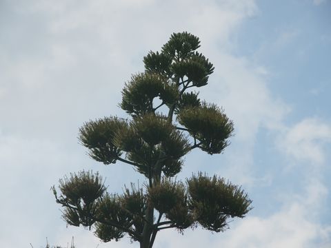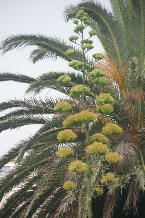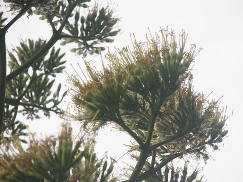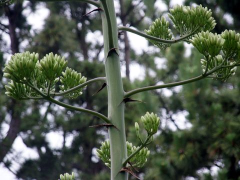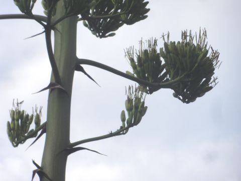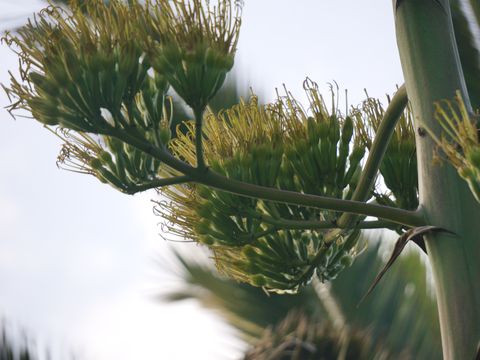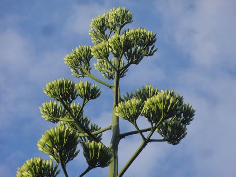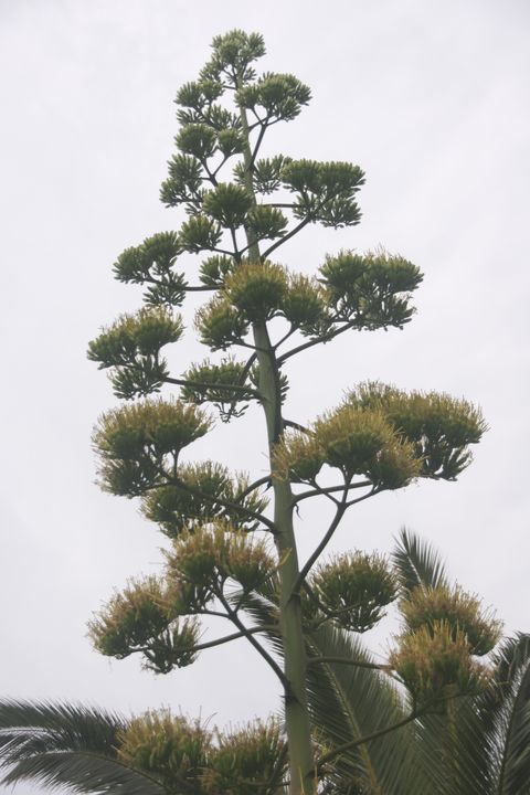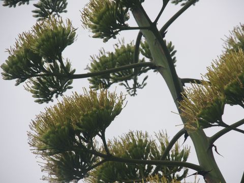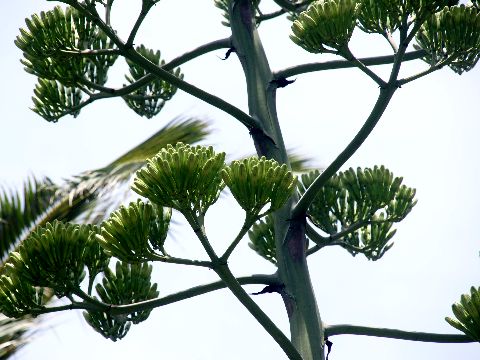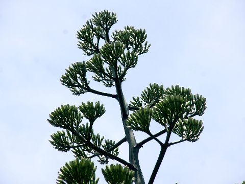 リュウゼツラン、咲き始めた下のほうから花が出てきたがまだ色が付いていない、これから上に向かって順に咲いて上までいけば満開。 |