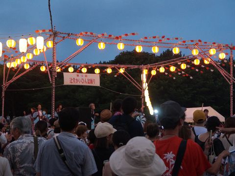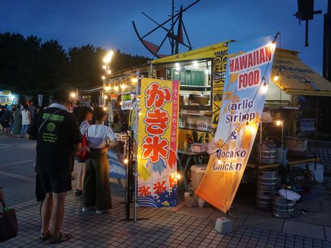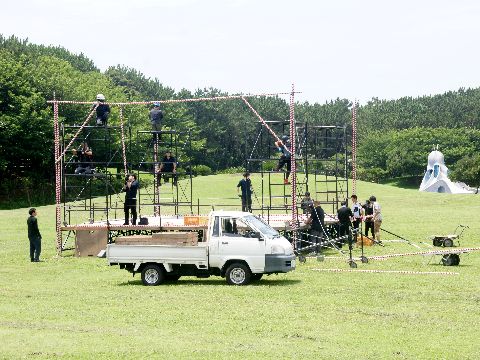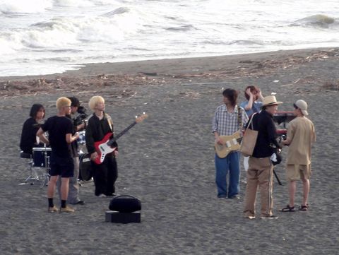 明日はお祭り、海岸では撮影?明日、明後日は「辻の盆」で盆踊りや屋台?が出て賑わう、臨時トイレの増設もあった。 海岸ではどこかのバンドがプロモーションビデオの撮影中のよう。実際に演奏しながら撮影で大変そう。 |
