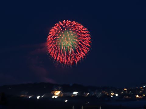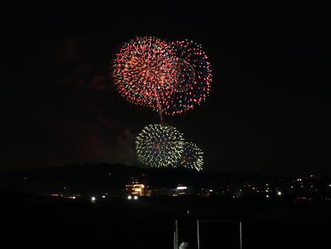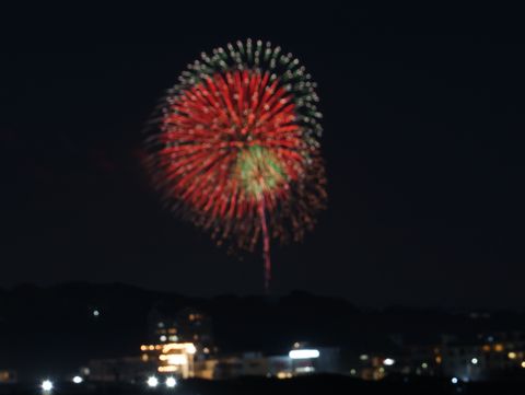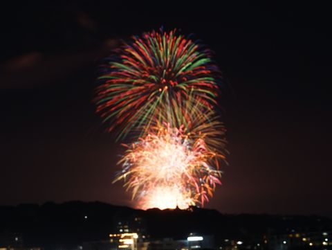 鎌倉の花火大会7時20分から50分間の花火大会、低い位置の花火は稲村ケ崎があるため見えないが音だけ聞こえる。 |