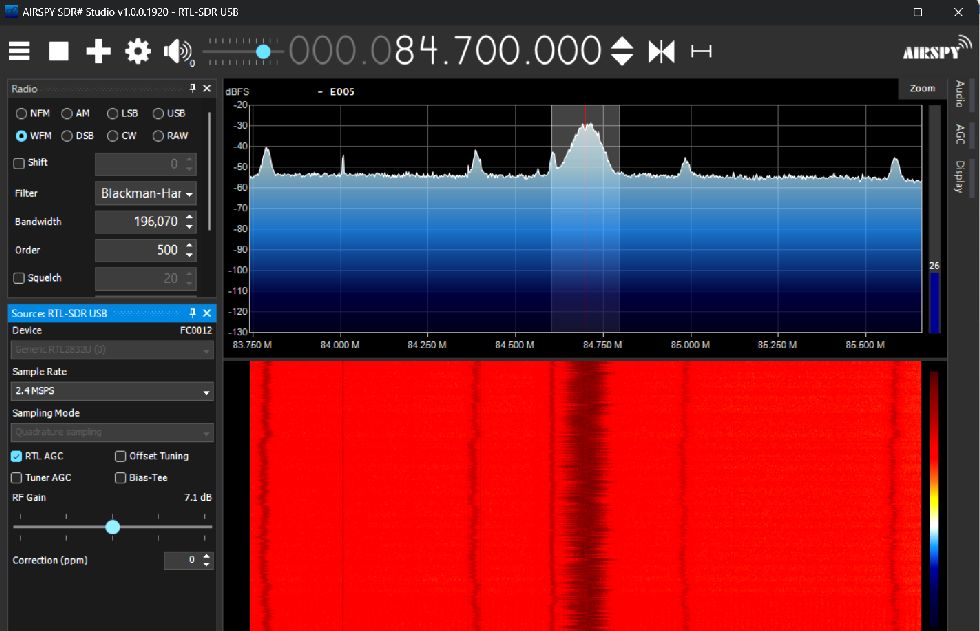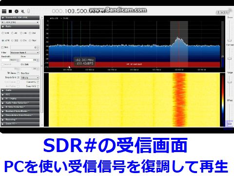SDR#の動作画面特徴?のウォーターフォール画面、FM放送のFMよこはまを受信しているところ。アンテナはHAM用 ホイップを流用して接続。 |