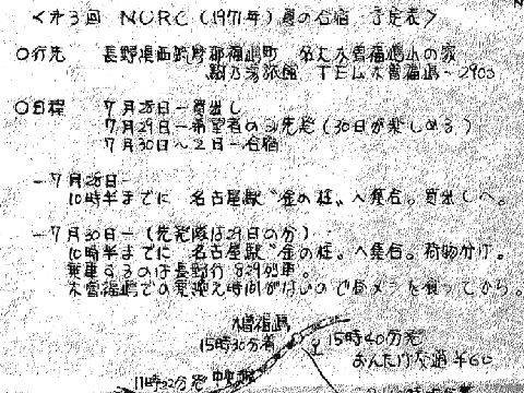 これが予定表:JH1CVO作成我々は車で行ったので往復310km位、コンテストの参加、ブレーカが飛ぶので石をぶら下げた記憶あり。 山登り部隊は徒歩で山頂までアタック、トランシーバ持参。自炊用の燃料はコイン式LPGコンロ、風呂は無いので駒の湯に借り湯だった。 |