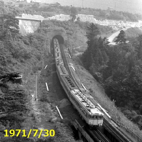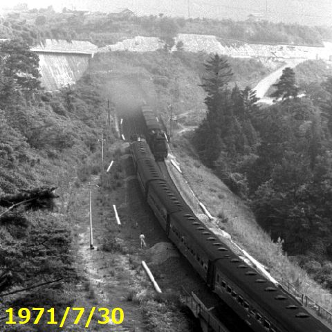 1971年の中央線3回目の合宿で木曽福島往復した時の画像、名古屋行きの急行?しなのが通過してゆく。 線路は複線化が完了して線路わきには架線柱が置かれて電化工事の準備中。位置関係からどうやら寝覚めの床の駐車場から 撮影したもの思われる。 |