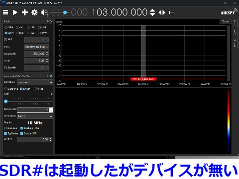 merucariで買ったチューナが届いた今度のものはSDR#で大丈夫という(意味は使用チップ)もの。RESOURCEできちんと認識されたので、無事にSDR#が起動できた。ドライバを入れる方法を失念し焦ったが。 |